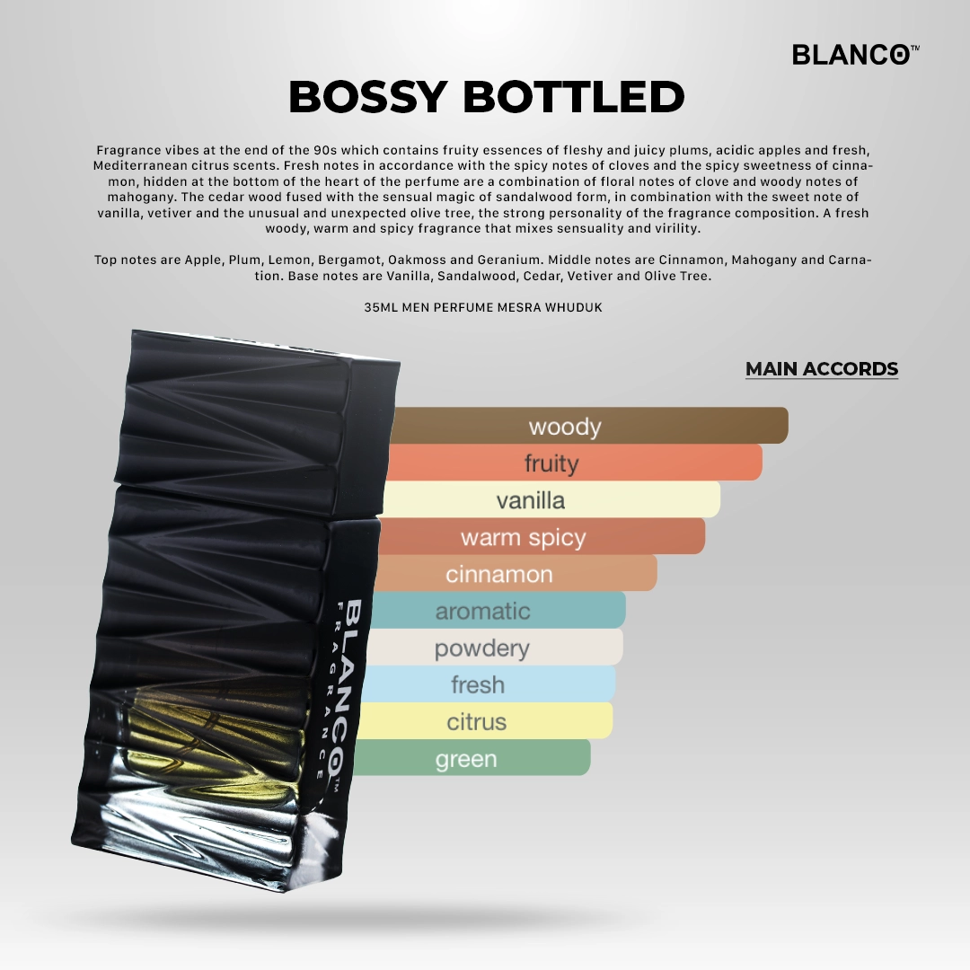 MEN PERFUME Top notes are Apple, Plum, Lemon, Bergamot, Oakmoss and Geranium; . middle notes are Cinnamon, Mahogany and Carnation; . . base notes are Vanilla, Sandalwood, Cedar, Vetiver and Olive Tree. MESRA WHUDUK 35ML / 420 Kali semburan.
