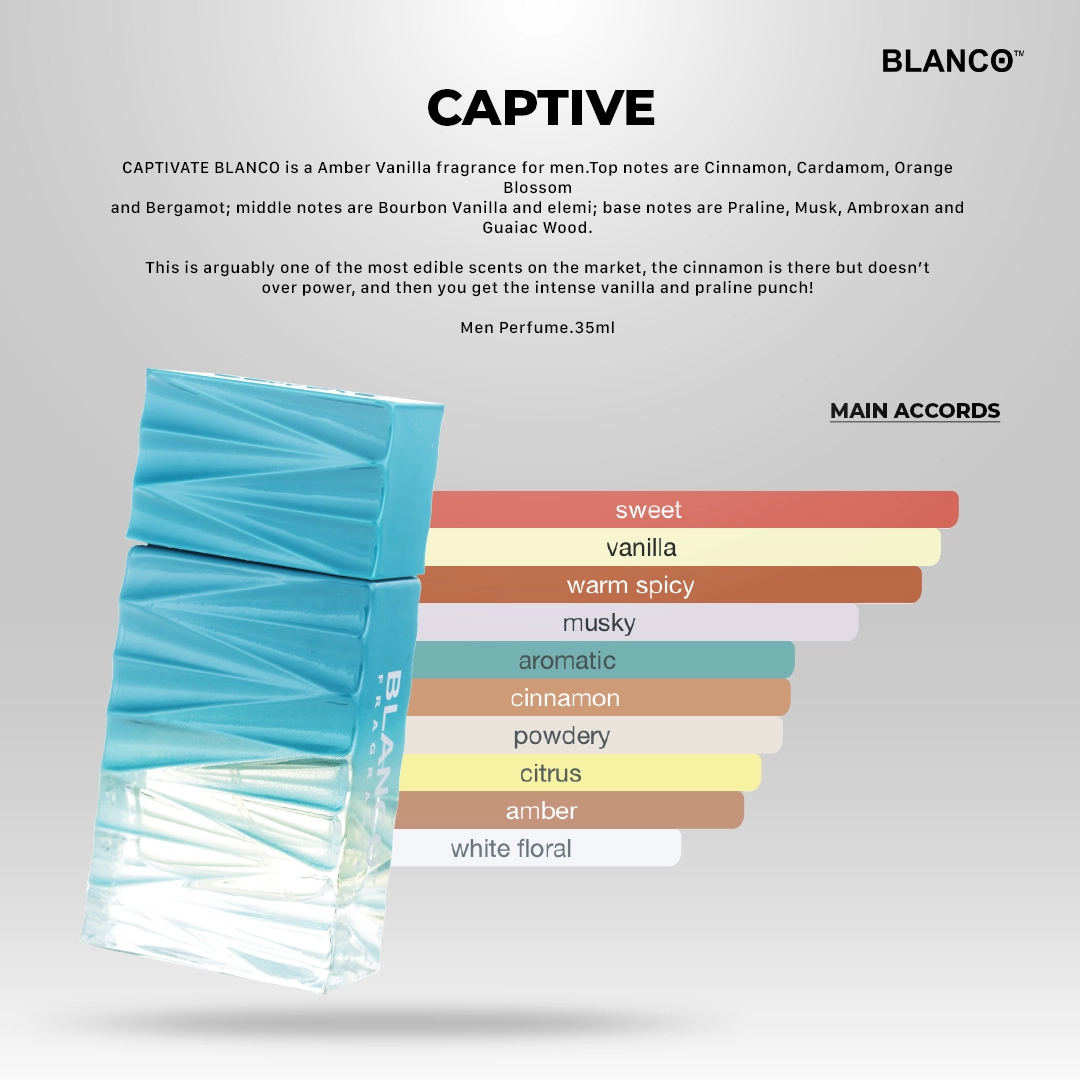 CAPTIVATE PUNCH BLANCO is a Amber Vanilla fragrance for men.Top notes are Cinnamon, Cardamom, Orange Blossom
