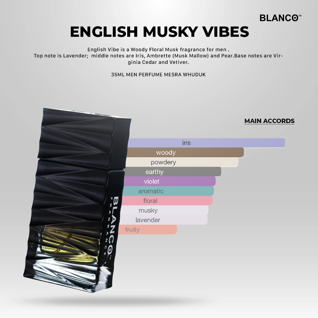 English Vibe is a Woody Floral Musk fragrance for men. . Top note is Lavender; middle notes are Iris, Ambrette (Musk Mallow) and Pear; base notes are Virginia Cedar and Vetiver. . MEN PERFUME 35ML WHUDUK FRIENDLY