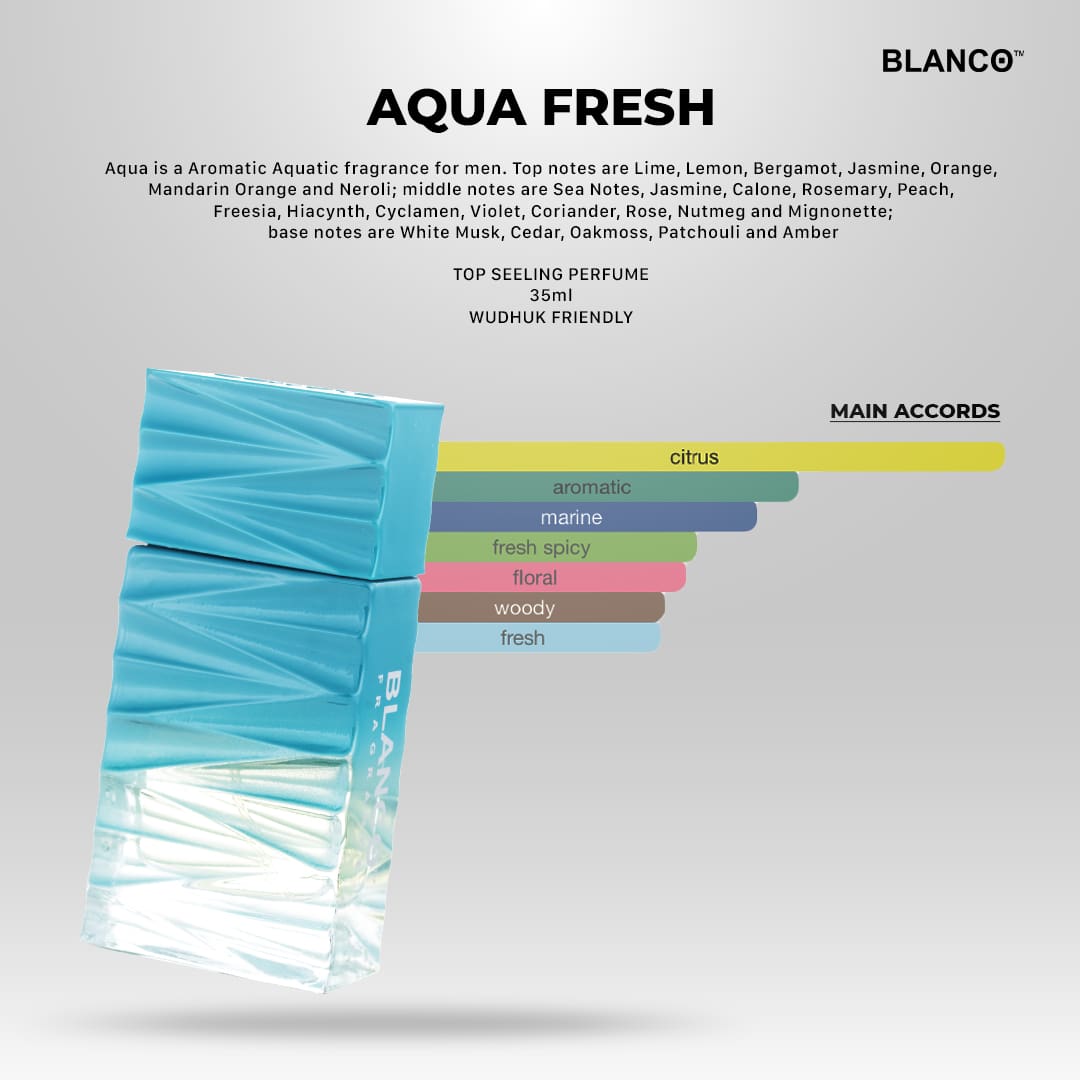 AQUA FRESH is a Aromatic Aquatic fragrance for men. Top notes are Lime, Lemon, Bergamot, Jasmine, Orange, Mandarin Orange and Neroli; middle notes are Sea Notes, Jasmine, Calone, Rosemary, Peach, Freesia, Hiacynth, Cyclamen, Violet, Coriander, Rose, Nutmeg and Mignonette; base notes are White Musk, Cedar, Oakmoss, Patchouli and Amber.