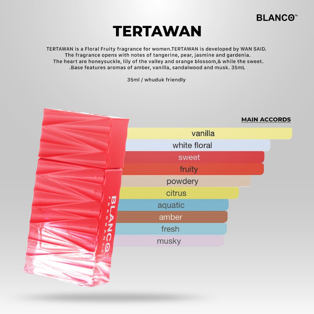 TERTAWAN is a Floral Fruity fragrance for women . TERTAWAN is developed by WAN SAID. The fragrance opens with notes of tangerine, pear, jasmine and gardenia; The heart are honeysuckle, lily of the valley and orange blossom,& while the sweet .Base features aromas of amber, vanilla, sandalwood and musk. .