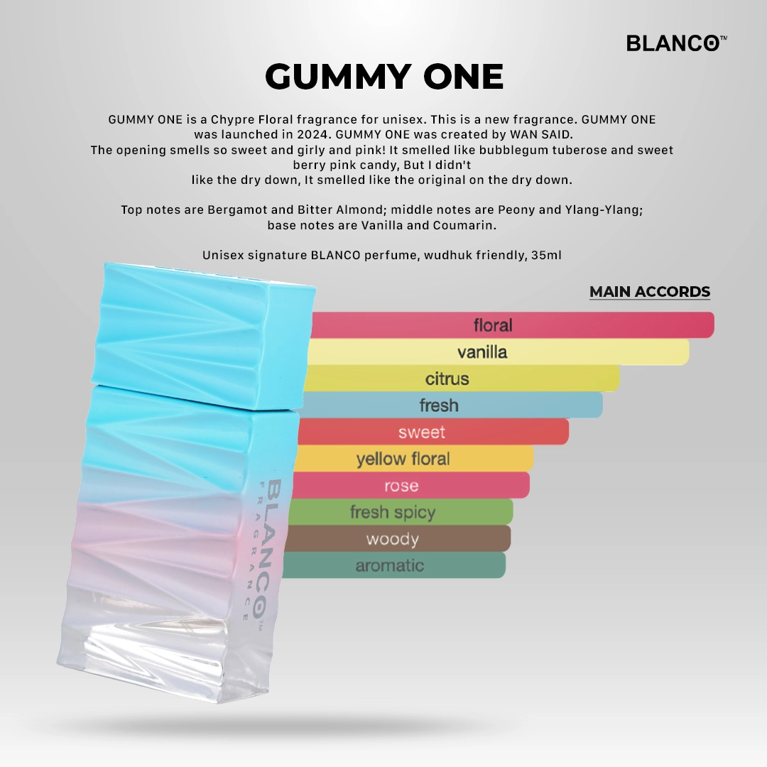 GUMMY ONE is a Chypre Floral fragrance for unisex. This is a new fragrance. GUMMY ONE was launched in 2024. GUMMY ONE was created by WAN SAID.