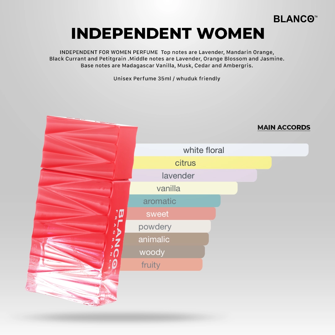 INDEPENDENT FOR WOMEN PERFUME Top notes are Lavender, Mandarin Orange, Black Currant and Petitgrain; . Middle notes are Lavender, Orange Blossom and Jasmine; Base notes are Madagascar Vanilla, Musk, Cedar and Ambergris. MESRA WHUDUK 35ML / 420 Kali semburan
