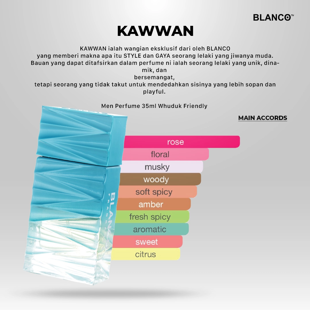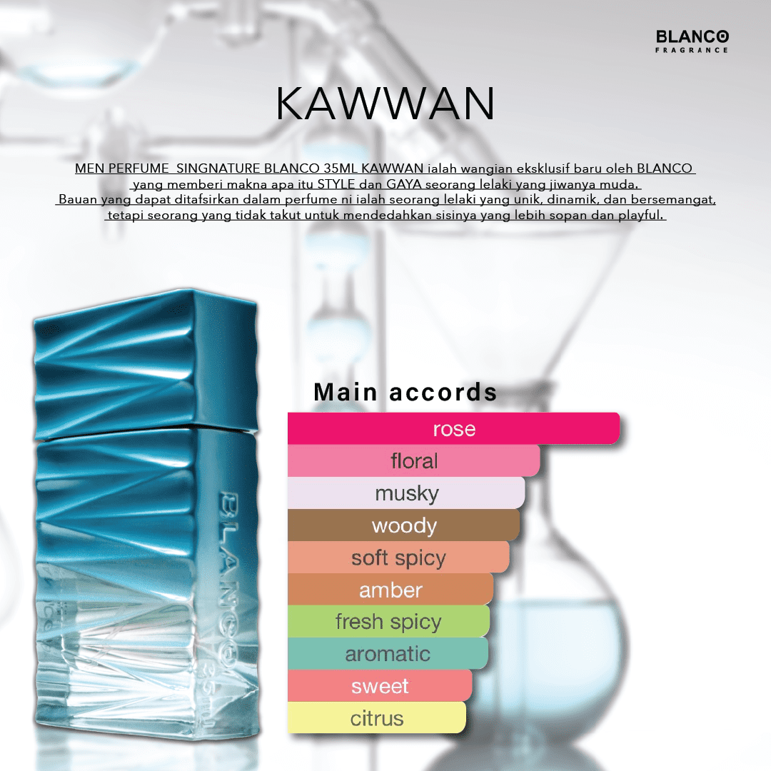 MEN PERFUME SINGNATURE BLANCO 35ML KAWWAN ialah wangian eksklusif baru oleh BLANCO yang memberi makna apa itu STYLE dan GAYA seorang lelaki yang jiwanya muda. Bauan yang dapat ditafsirkan dalam perfume ni ialah seorang lelaki yang unik, dinamik, dan bersemangat, tetapi seorang yang tidak takut untuk mendedahkan sisinya yang lebih sopan dan playful. KAWWAN adalah sentuhan formulasi dari Wan said yang ternilai Bauan paling dominant spicy masculine rose Top notes: Italian bergamot, green pear, elemi, pink pepper, Indonesian nutmeg