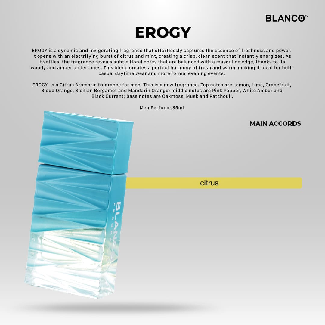 EROGY is a Citrus Aromatic fragrance for men. This is a new fragrance. Top notes are Lemon, Lime, Grapefruit, Blood Orange, Sicilian Bergamot and Mandarin Orange; middle notes are Pink Pepper, White Amber and Black Currant; base notes are Oakmoss, Musk and Patchouli.
