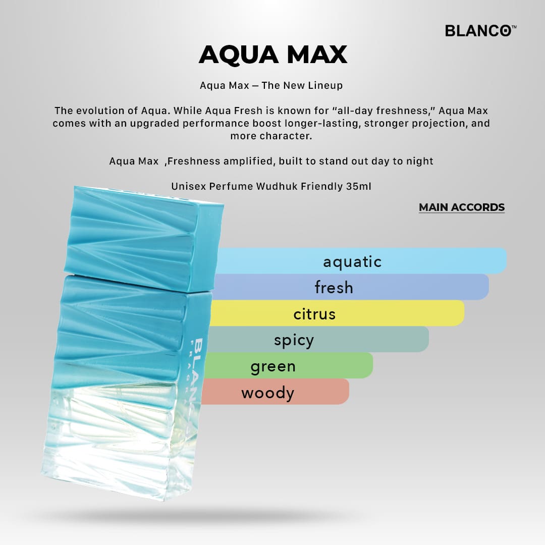 Perkembangan Aqua. Sementara Aqua Fresh dikenali dengan “kesegaran seharian”, Aqua Max hadir dengan peningkatan prestasi yang lebih lama, projeksi yang lebih kuat, dan lebih banyak watak. Aqua Max, kesegaran diperkaya, dibina untuk menonjol dari siang hingga malam. 35ml.