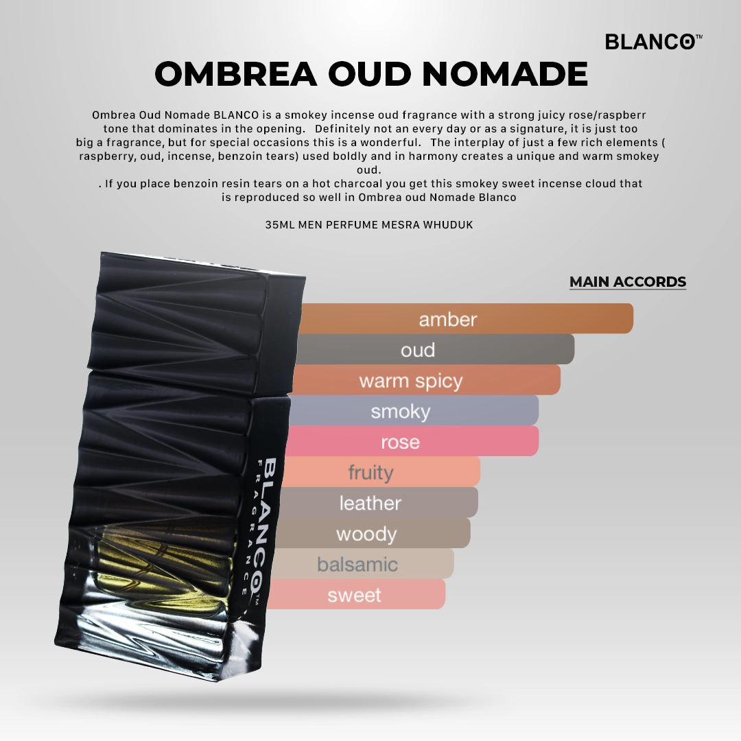 Ombrea Oud Nomade BLANCO is a smokey incense oud fragrance with a strong juicy rose/raspberry tone that dominates in the opening. Definitely not an every day or as a signature, it is just too big a fragrance, but for special occasions this is a wonderful. The interplay of just a few rich elements (raspberry, oud, incense, benzoin tears) used boldly and in harmony creates a unique and warm smokey oud. . If you place benzoin resin tears on a hot charcoal you get this smokey sweet incense cloud that is reproduced so well in Ombrea oud Nomade Blanco UNISEX PERFUME MESRA WHUDUK