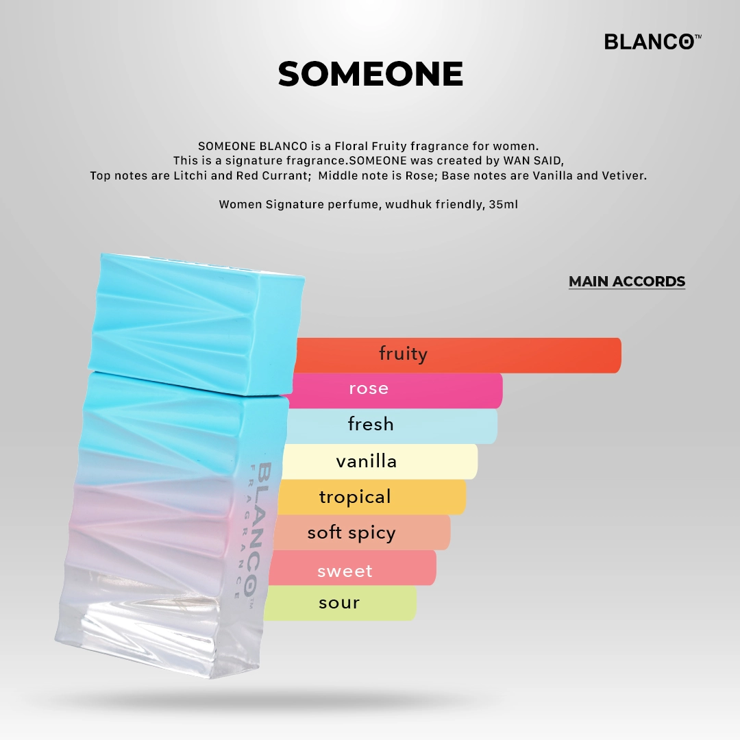 SOMEONE BLANCO is a Floral Fruity fragrance for women. This is a sinature fragrance. SOMEONE was created by WAN SAID, Top notes are Litchi and Red Currant; Middle note is Rose; Base notes are Vanilla and Vetiver. . WOMEN PERFUME 35ML WHUDUK FRIENDLY