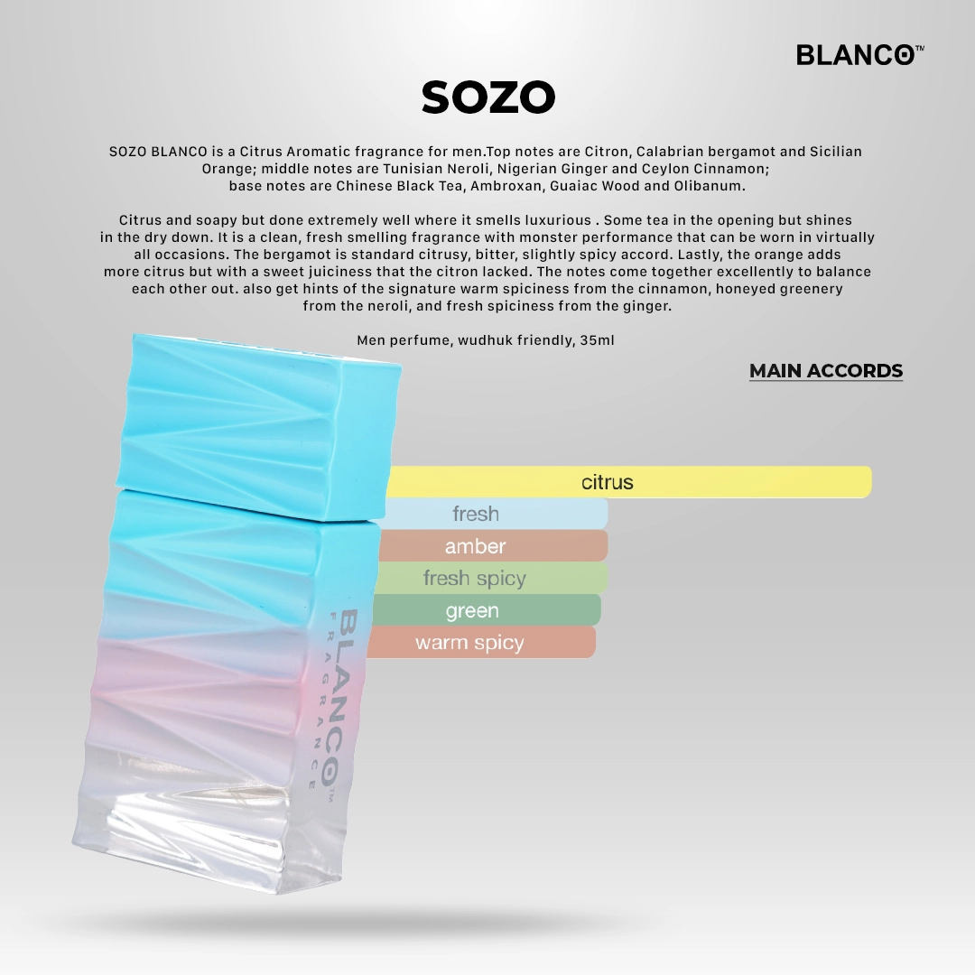 SOZO BLANCO is a Citrus Aromatic fragrance for men.Top notes are Citron, Calabrian bergamot and Sicilian Orange; middle notes are Tunisian Neroli, Nigerian Ginger and Ceylon Cinnamon; base notes are Chinese Black Tea, Ambroxan, Guaiac Wood and Olibanum.